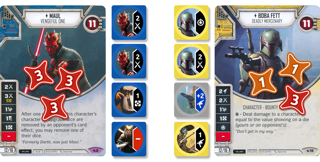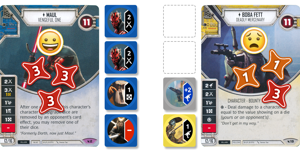 My buddy Greg came over one evening shortly thereafter, and I rolled out the Maul/Vader build against his Boba/Phasma. Battle of Wills didn’t show up in our first match, and his deck showed little mercy against mine. I finally drew the card late in the second match, with Vader already dead and Maul heavily wounded. But this was my chance! I played the card as my first action of the round, and Greg opted to activate Boba Fett as a response. Both characters had a pair of upgrades on them, and here’s the resulting roll-off: