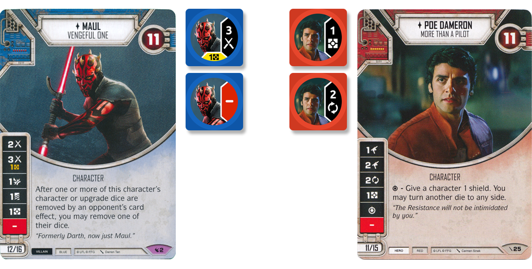 He hit a 2 Focus and 1 Resource, equalizing Maul’s dice total. (Stupid blank!) So now, given the rules of Battle of Wills, both characters’ dice had to be removed, since both shared the lowest value.