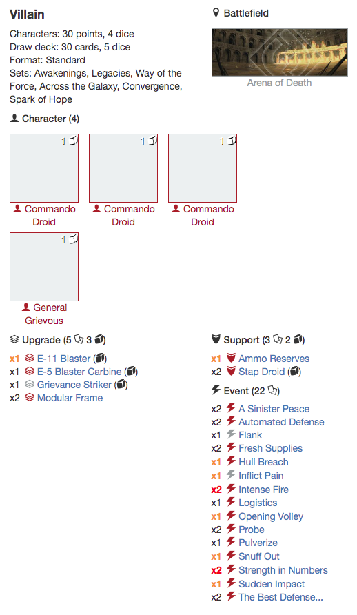 It’s not competitive, but it’s pretty fun! Here’s my take on a red villain “burn” deck. I’m actually going to try and remove some of the dice upgrades and replace them with more hate (damage from hand). Suggestions are always welcome!