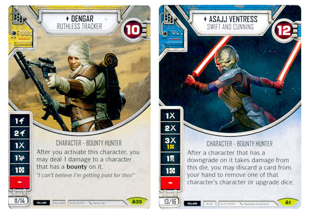 My next two decks are heavy on the Convergence set. As I discussed in the last episode of my podcast, I participated in a sealed box tournament for its release. It was a lot of fun to crack 36 packs and go to battle, even if I didn’t win any of my matches. Two of the characters I pulled from my box were Dengar and the new Asajj Ventress, both of which are Bounty Hunters. Given their complimentary point value and common theme, I knew I wanted to play them. I ordered second copies of both characters and the Punishing One on eBay and quickly put a deck together.